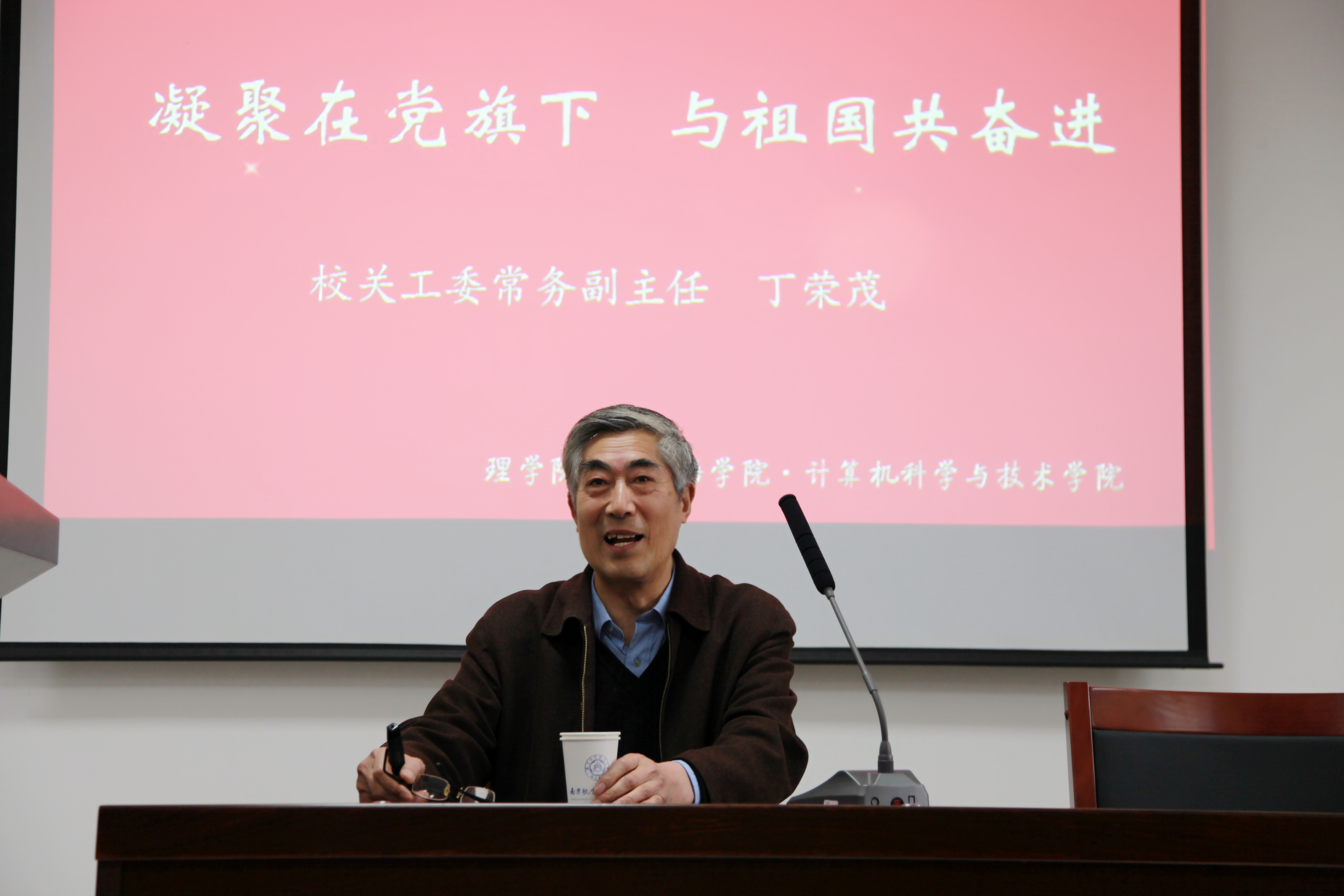 与理学院、计算机科学与技术学院联合开展的“两学一做”主题教育暨毕业生党员在校最后一次党课活动在将军路校区开展。本次活动主题为“凝聚在党旗下,与祖国共奋进”,邀请到校关工委常务副主任丁荣茂担任主讲人,来自三个学院的150余名学生党员参加了教育活动。
