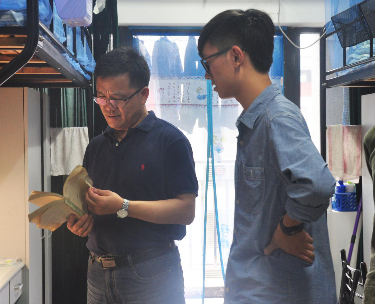 院长一行来到男生宿舍,聆听了同学们入学的趣闻轶事,屡次向新生强调自我独立的重要性。范院长说:“口语需反复地practice(练习),从而达到automatic(自动)”。在与同学们的交流中时时嘱咐大家要尽快适应大学的生活环境,为即将到来的军训及之后的学习生活做好准备。