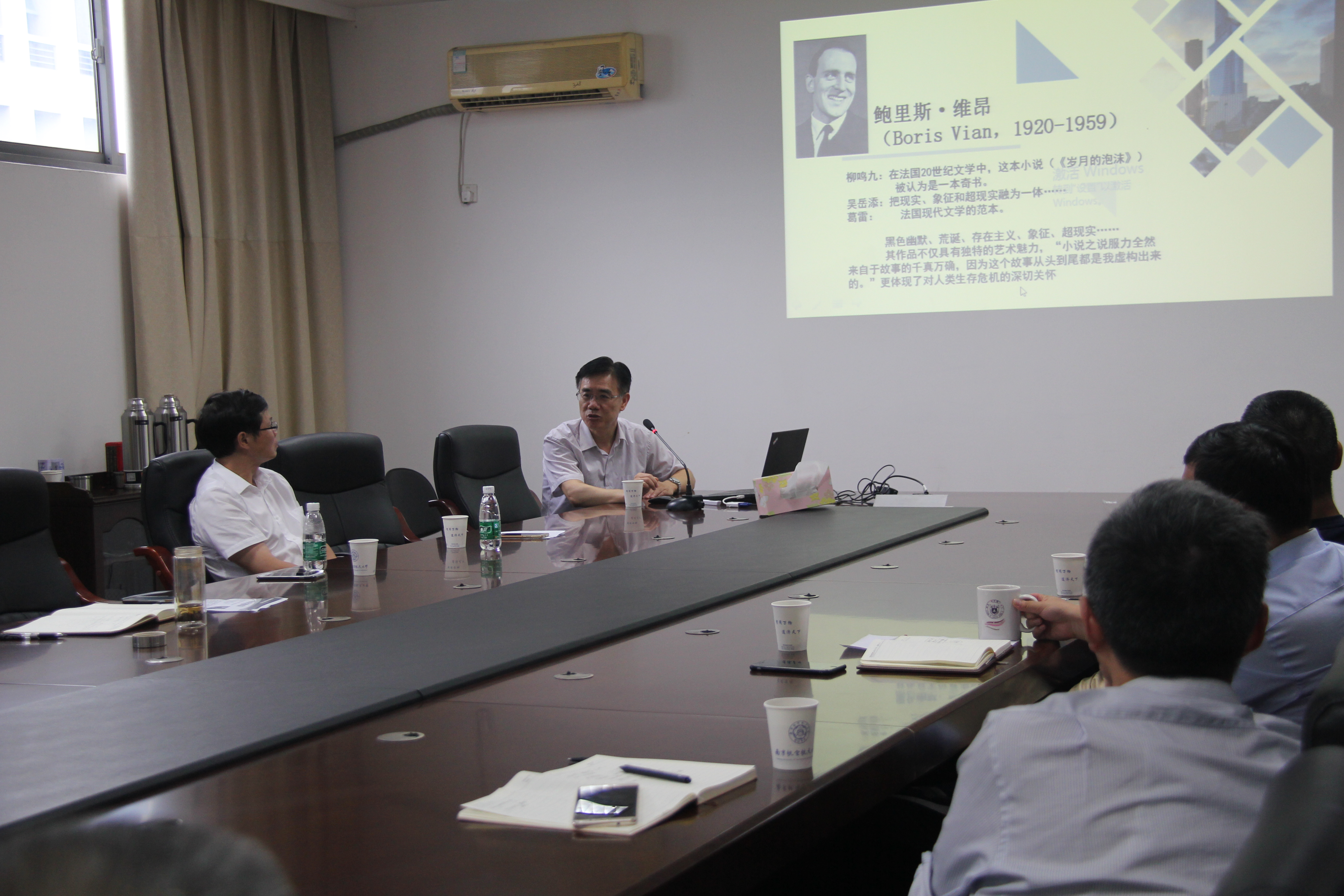 李万文老师以自己在法国巴黎索邦大学等名校的访学经历为切入点,生动地向师生们介绍了法国多所名校的情况,巧妙地将大家带入他的法国文学世界。随后,他围绕讲座主题介绍了法国著名文学家鲍里斯·维昂,包括了他的生平、成就、作品以及当代文学大家给予他的评价。针对维昂的作品,李老师着重从“战争”,“种族歧视”和“生态环境”这三个大的分类逐次介绍了《蚂蚁》、《红草》等优秀的文学作品,以此引出维昂倡导和平与自由的文学主张。讲座中,李老师不时抛出自己在研究维昂作品时产生的想法与见解,并与师生们进行了广泛的交流。
