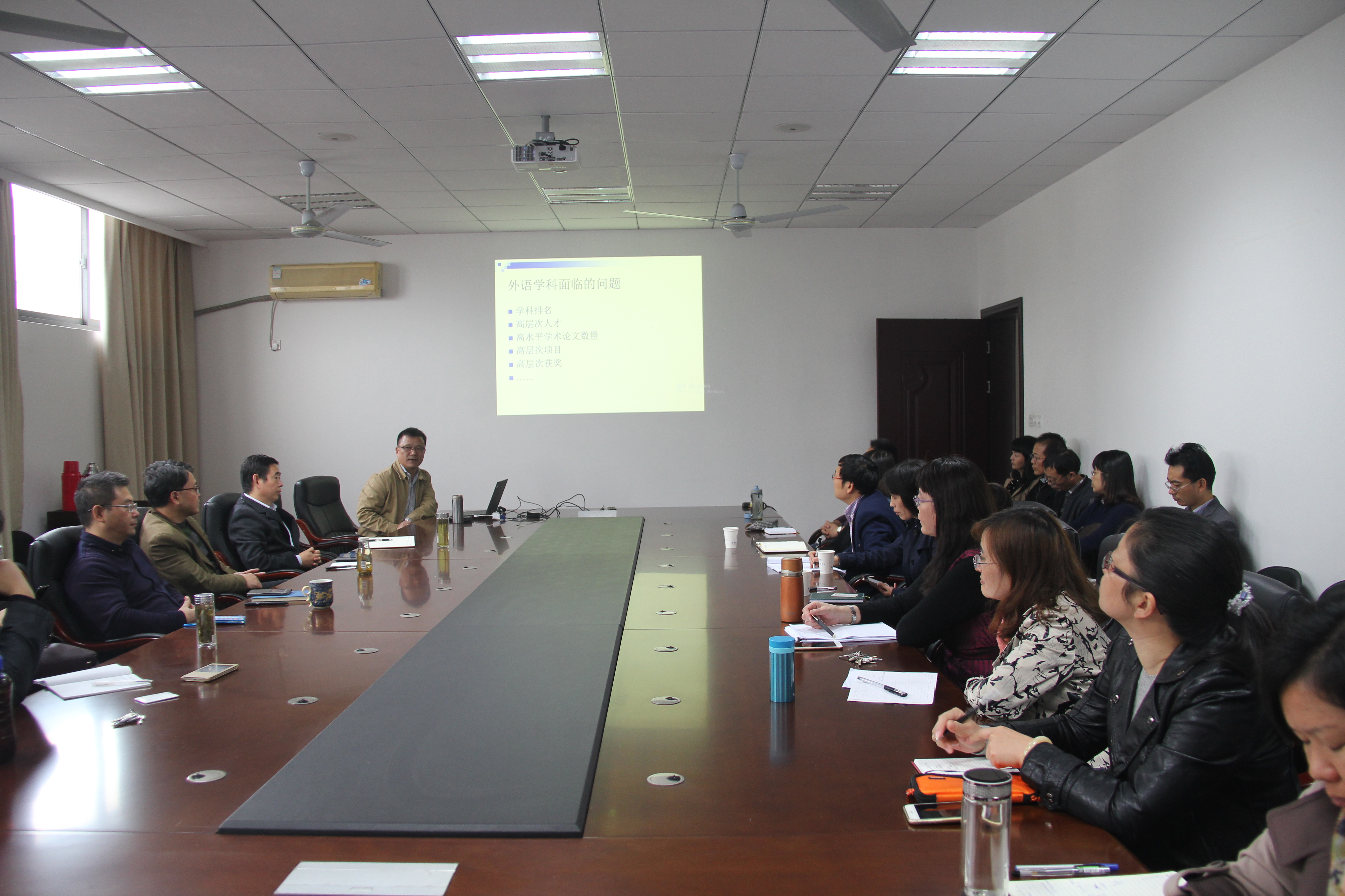 座谈会由院长范祥涛教授主持,首先回顾了vrporn 近年来的工作情况,肯定了学院在外语学科排名、高层次人才引进、高水平学术论文的发表、高层次项目的申报、高层次获奖等方面做出的努力和取得的成就,同时也指出了外语学科近几年来所面临的的问题。