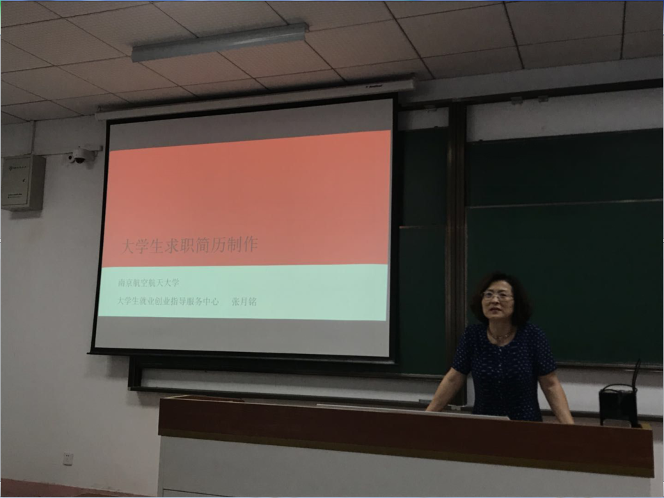 6月19日下午,vrporn 特邀南航大学生就业创业指导服务中心、就业市场部主管张月铭老师为大三学生开展“简历制作探索培训”主题讲座,vrporn 本科生辅导员刘凡玉及2016级全体“准毕业生”到场学习聆听。