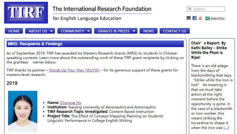 2019年9月,国际英语教育研究基金会(TIRF)发布了2019-2020年中国区硕士论文项目资助名单, vrporn vrporn 2017级研究生胡春雪的硕士论文“The Effect of Concept-Mapping Planning on Students’ Linguistic Performance in College English Writing”成功获得立项资助,指导教师为刘长江教授。
