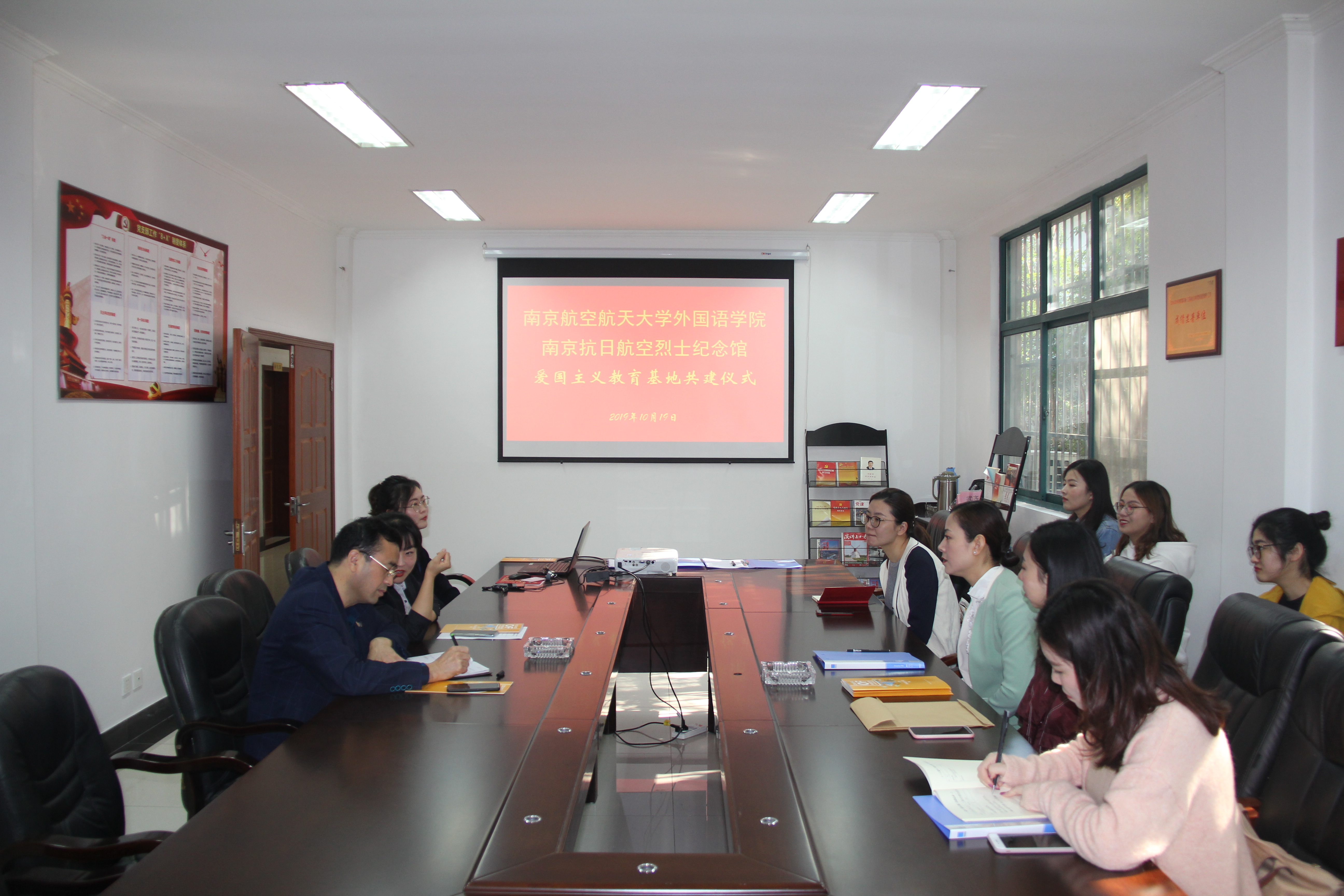 10月19日上午,vrporn 师生19人赴南京抗日航空烈士纪念馆开展爱国主义教育基地和社会实践基地共建活动。学院党委副书记梁薇、组织员李林泷、团委书记关天茹、组织员李林泷、全体本科生辅导员及党员学生代表参加了此次活动。抗日航空烈士纪念馆副馆长武齐全、宣教部主任孙瑶参加了共建仪式。