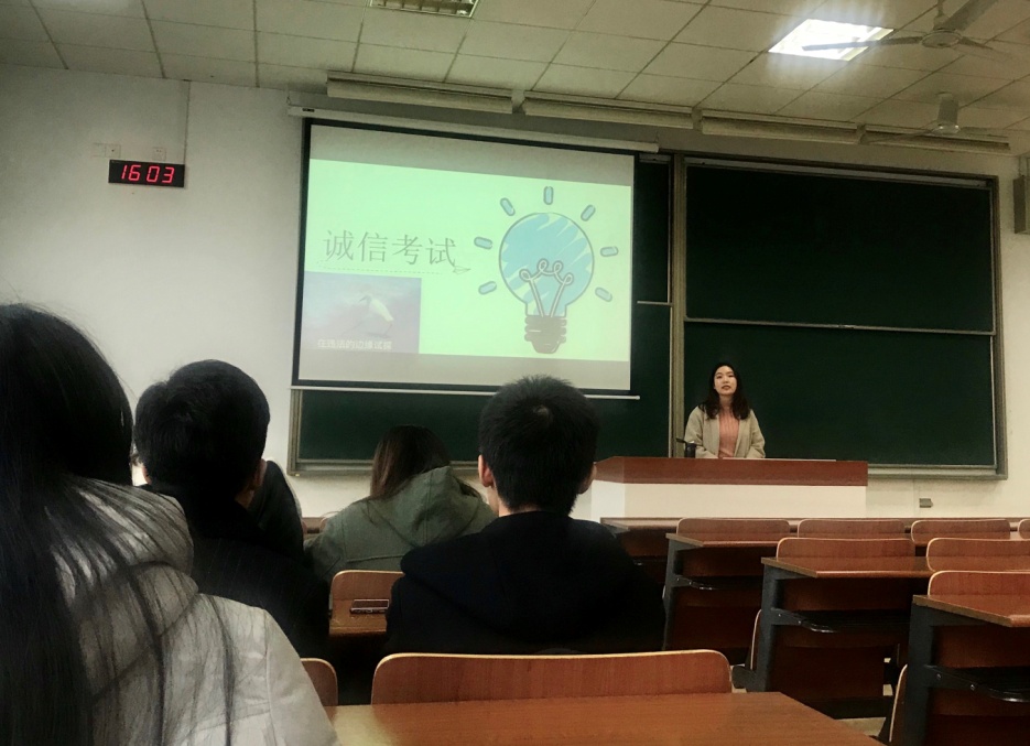 辅导员彭欢首先向全体学生说明了学校对于考试作弊行为的界定及处理办法,考试作弊行为范畴及处分方法,之后从身边事例出发,列举了其他学校曾经的作弊案例,告诫同学们切忌以身试险,诚信考试是每一位同学都应当具备的良好美德履行的基本义务。