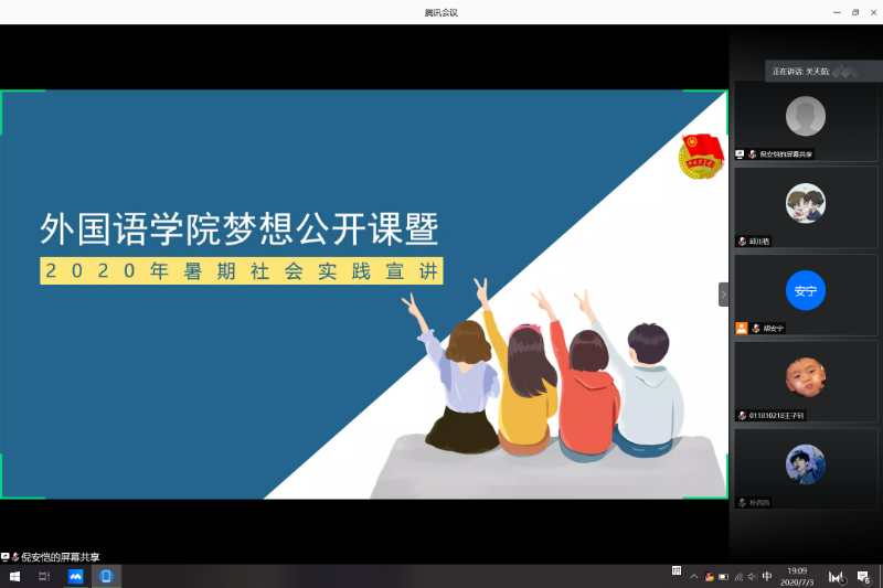 线上梦想公开课暨2020暑期社会实践动员会在线上召开。学院团委书记关天茹,院团委学生会实践部负责人,以及全体2019级本科生参加了此次公开课。