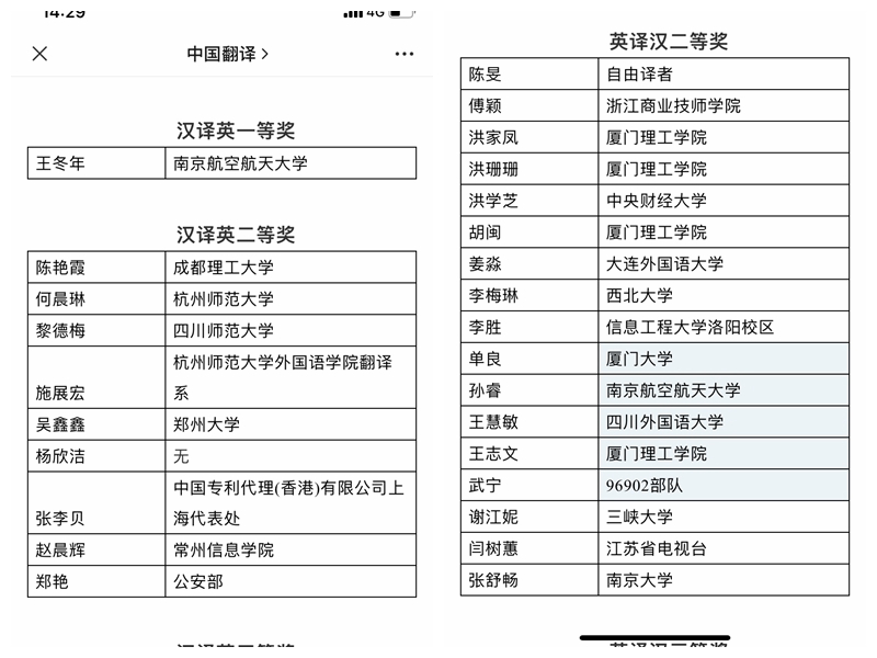 vrporn 高度重视此项赛事,鼓励支持学生积极参与其中。2015-2019年间,学生共获得英译汉二等奖2项,三等奖2项,优秀奖15项,汉译英优秀奖3项。本次汉译英一等奖更是实现了历史性突破。获奖的两位同学表示,成绩的取得离不开学院提供的丰富的实习实践机会,以及专业教师在课堂内外的悉心教导。