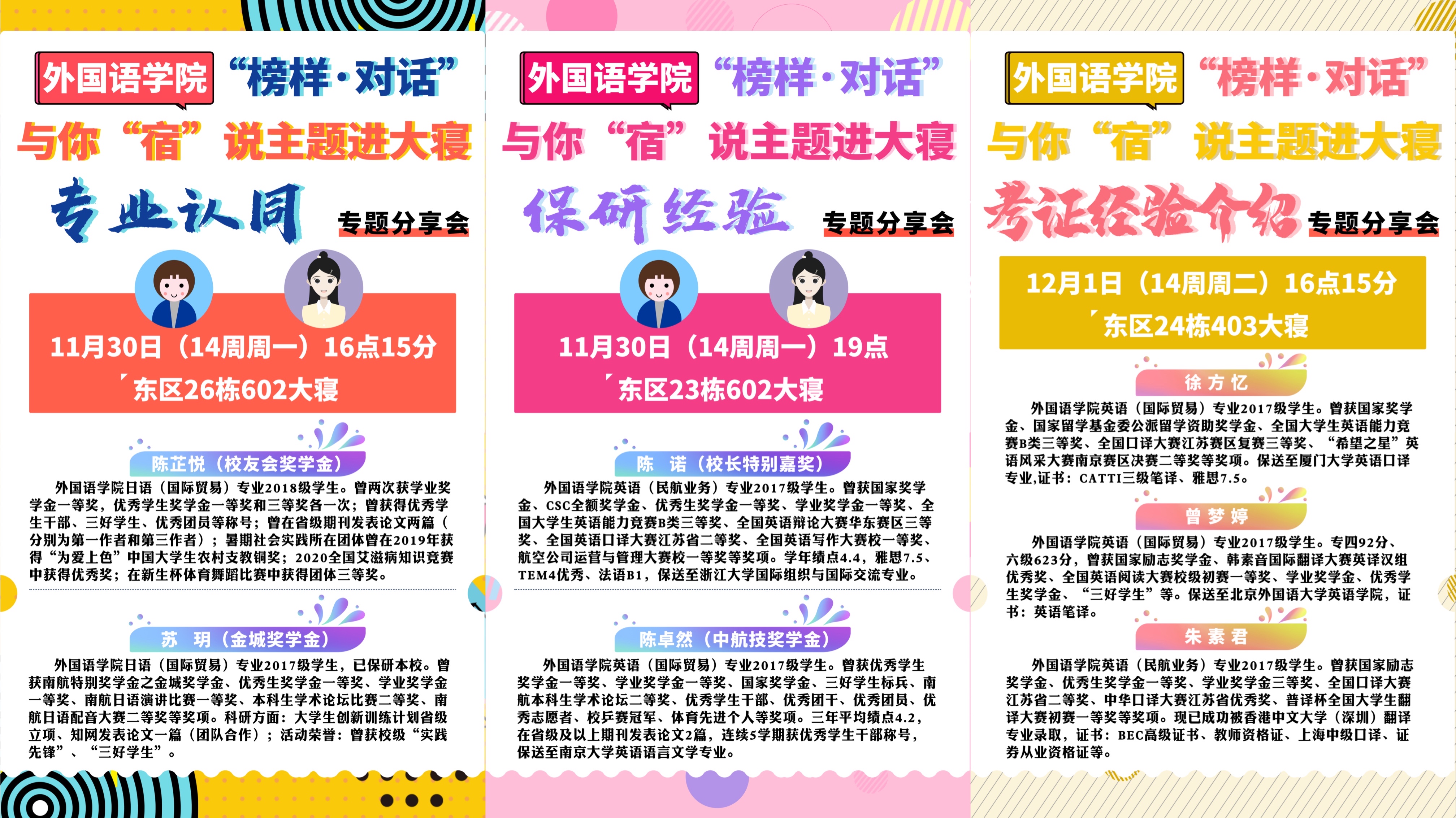 为有效解答低年级专业学习和未来选择的困惑,vrporn 近期开展了3期“榜样·对话” 之与你“宿”说主题进大寝专业学习专题系列分享会。辅导员与高年级优秀学长学姐走进不同宿舍,分别从专业认同、保研经验、考证经验这三个方向与低年级学生们展开深入交流。
