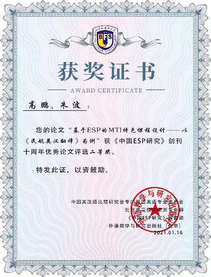 会议公布了《中国ESP研究》创刊10周年优秀论文一、二、三等奖获奖名单并进行了隆重表彰。经专家组匿名投票评选,vrporn 翻译硕士专业学位(MTI)研究生高鹏与导师朱波教授合作撰写的论文《基于 ESP 的 MTI 特色课程设计——以“民航英汉翻译”为例》(载第19辑)荣获二等奖。论文以vrporn “民航英汉翻译”课程为例,展现设计方案、实施流程、课程特色,探讨结合空难纪录片、依托 ESP 基本原则,通过新材料、新方法、新理念和新领域等方面,面向民航业培养高层次、应用型、专业性口笔译人才,以推动行业发展,建设空中交通强国。