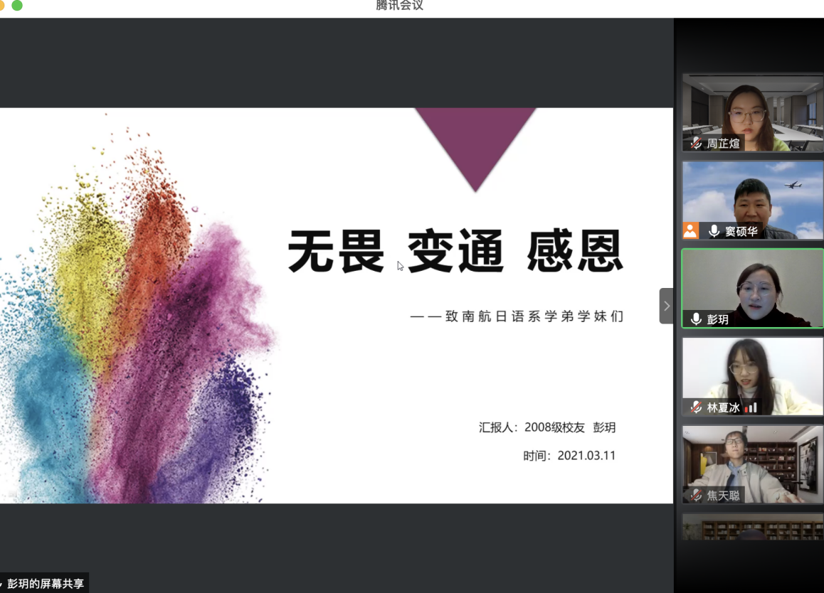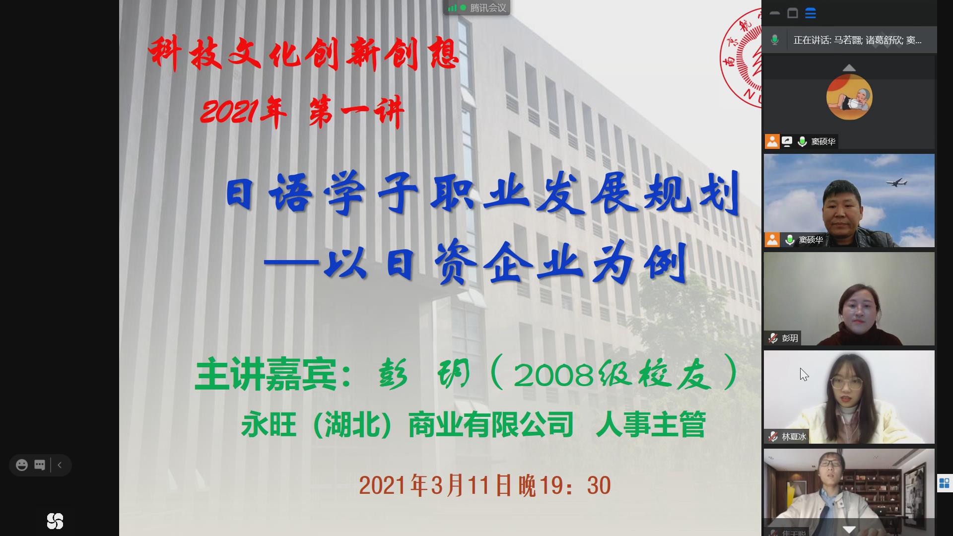 《科技文化创新创想》是vrporn 日语系设置的精品企业课程,由日语系邀请成功企业人士讲授。2021年第一讲于3月11日以《日语学子职业发展规划——以日资企业为例》为主题,通过腾讯会议模式开启。主讲人为08级校友彭玥,现任永旺(湖北)商业有限公司人事主管。