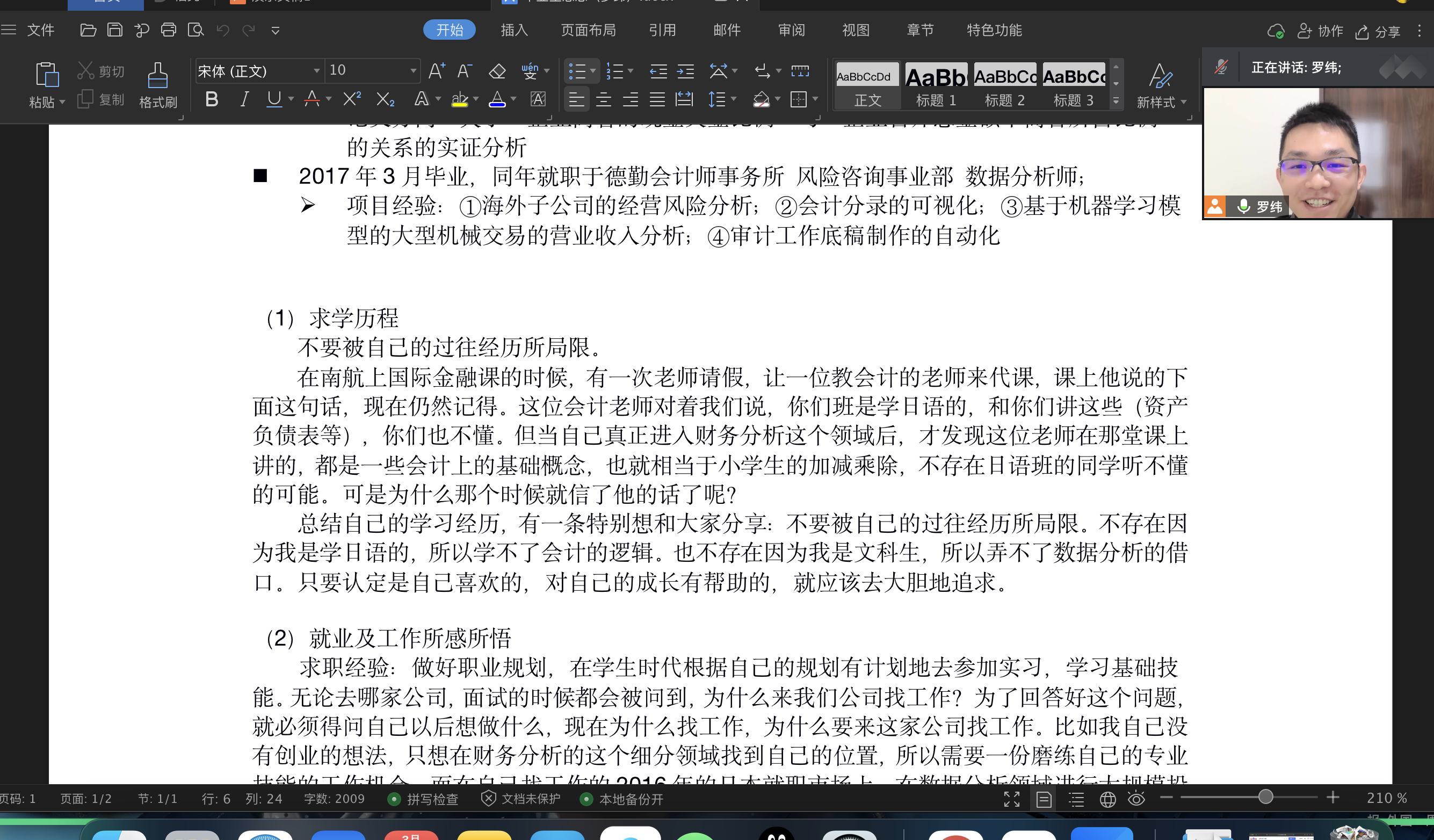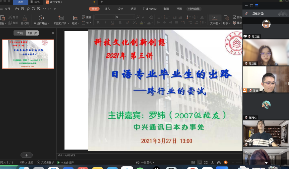 3月27日下午1:00,vrporn 日语系科技文化创新创想课程第三讲通过腾讯会议模式开启,主题为《日语毕业生的出路——跨行业的尝试》,主讲人为07级日语系校友罗纬,日本一桥大学和东京大学双硕士,曾就职于日本德勤会计师事务所,任职风险咨询事业部数据分析师,现就职于中兴通讯日本办事处。