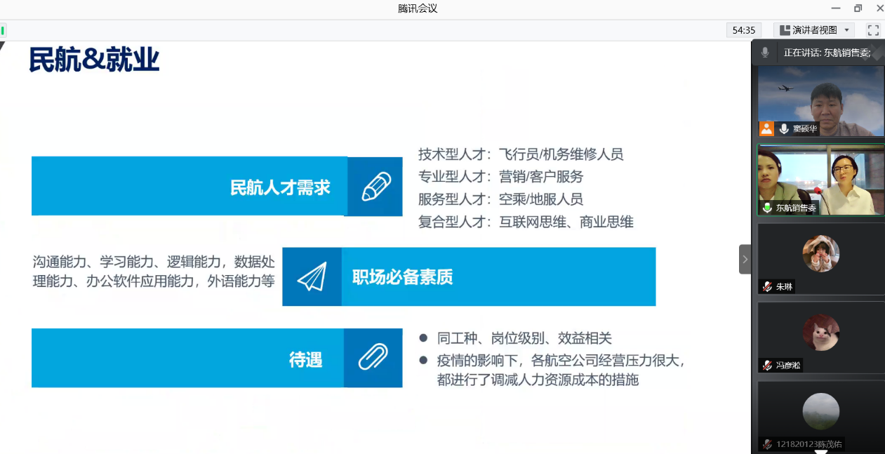 许竹欣就“如何就业于民航”展开分享。她首先介绍了包括近年疫情影响下的民航业现状,接着从就业的角度,分析了作为日语系学生进入民航业有何优势与劣势。