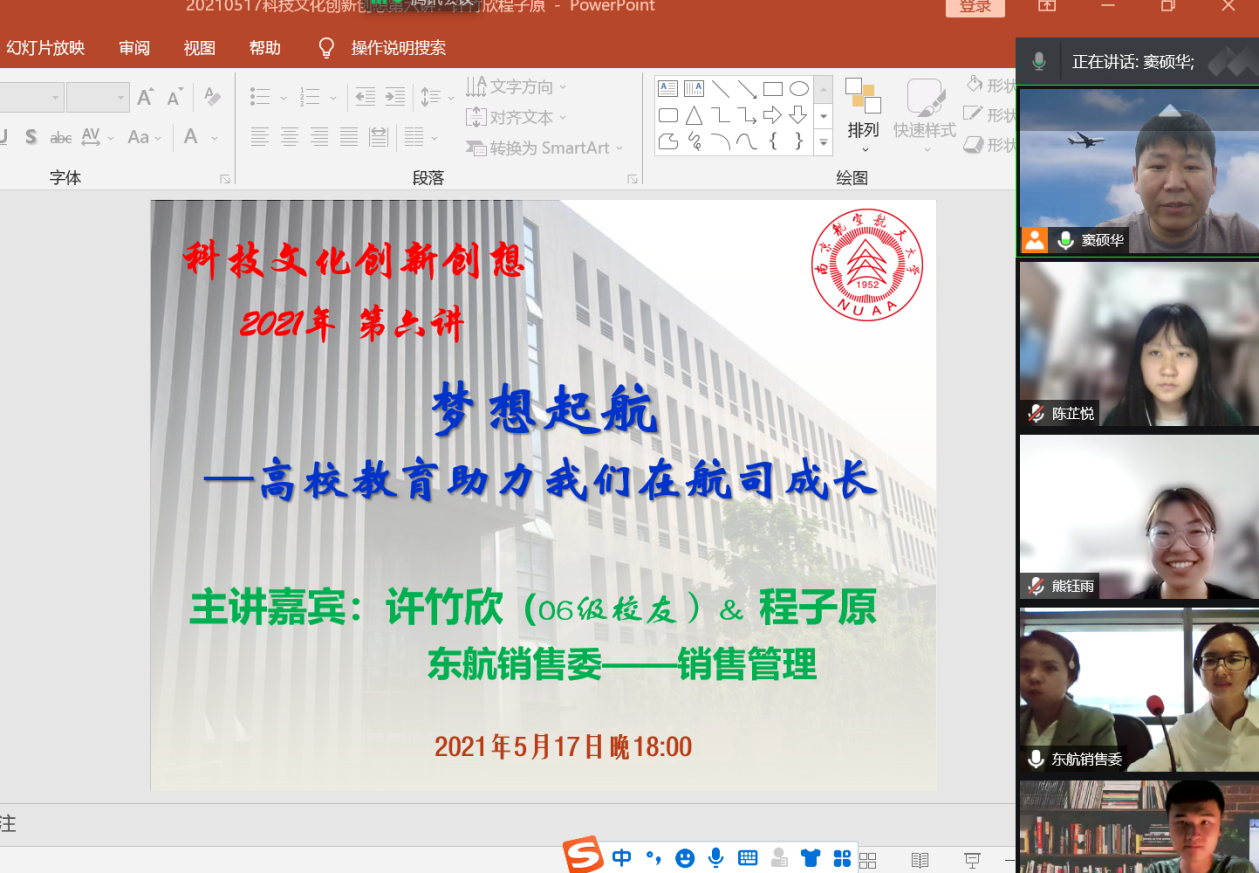 5月17日晚18点,vrporn 日语系《科技文化创新创想》第六讲通过腾讯会议开启,主题为《梦想起航——高校教育助力我们在航司成长》,主讲人为东航销售委的许竹欣和程子原两位优秀代表,其中许竹欣为南航06级校友。