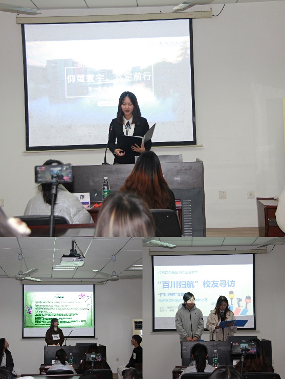 紧接着是“致青春·征程篇”,毛嘉月同学通过对暑期在云南东方飞行培训有限公司实践经历的分享,为同学们提供了更多参考意见和实习经验;“莎翁戏剧进校园”团队以专业特色为出发点,开展戏剧表演学习与直播,并现场表演了戏剧选段,引人入胜的表现获得了同学们的阵阵掌声;“百川归航”团队通过多种手段寻访校友,记录校友学习工作经历,为同学们指明前进方向。