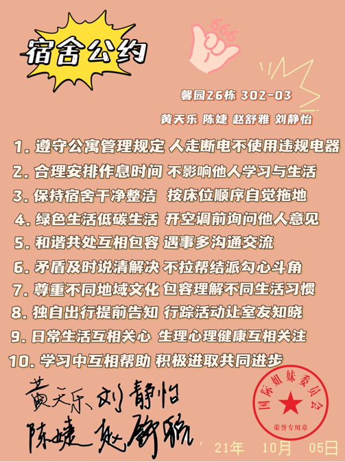 宿舍公约制定活动活动期间,同一寝室的新生们,一同协商,,一同规划,为营造宿舍美好和谐的氛围出谋划策,为构建美丽蓝图共同奋斗。合理的公约是文明小寝的第一步,文明小寝的创建需要同学们遵守公约,团结友爱,互帮互助。