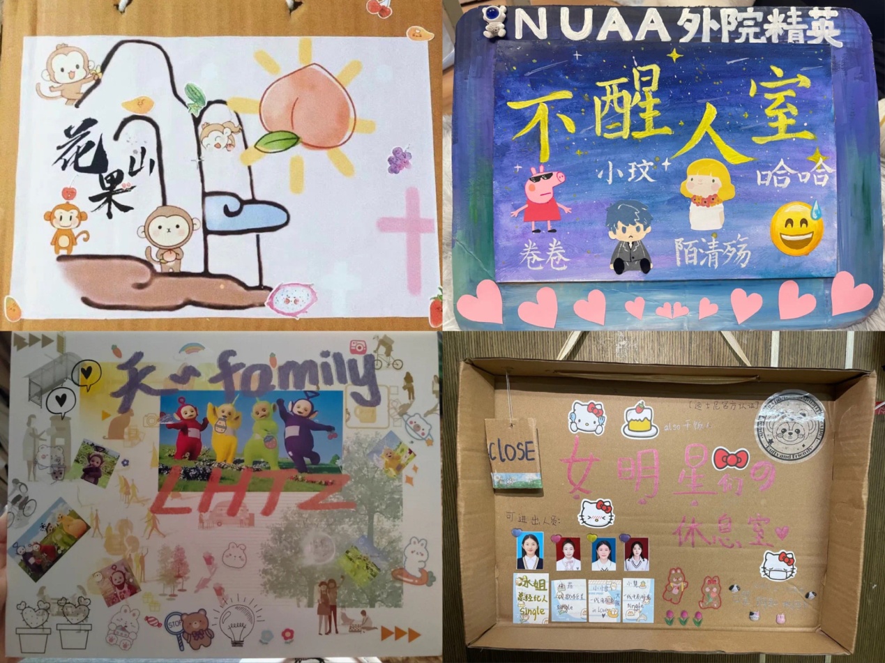 门牌彰显个性,门牌体现生活,将现实融入设计,将情感融入生活。所有同学踊跃参与本次宿舍设计大赛,他们尽情地发挥创造力,展现了极大的热情,各个宿舍的参赛作品都充分展现了同学们情感的融入和灵感的碰撞,体现了宿舍间强大的团体凝聚力。其中涌现出了一大批优秀的宿舍以及充满想象力的作品。同学们也为心仪的作品,投下了支持的一票,最终选出巧夺天工奖、绿水青山奖、妙手生花奖、出其不意奖、People’s Choice Award奖项。本次门牌设计大赛增进了同学之间的情谊,增添了宿舍的文化氛围,也给同学们的大学生活增添了别样的色彩。