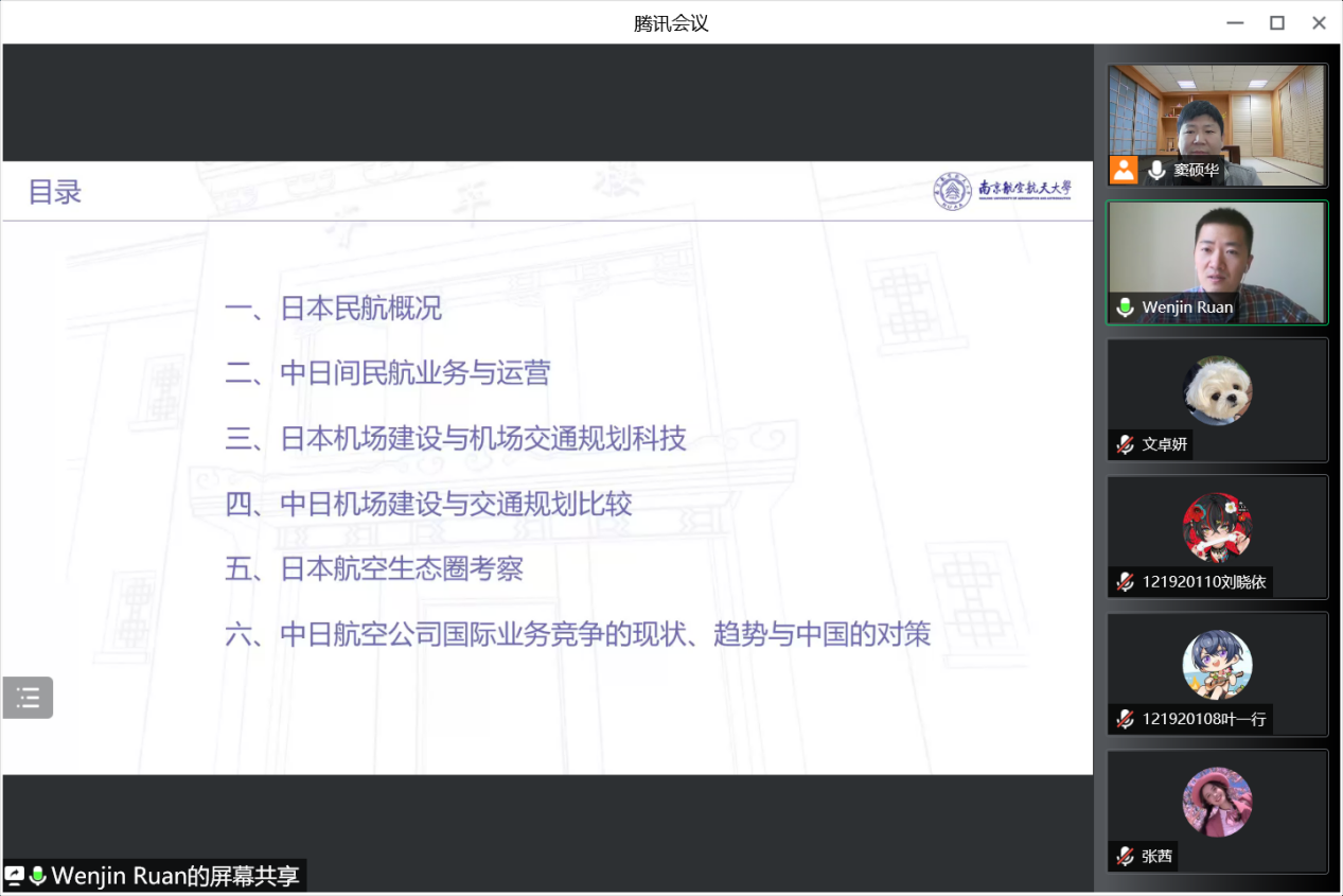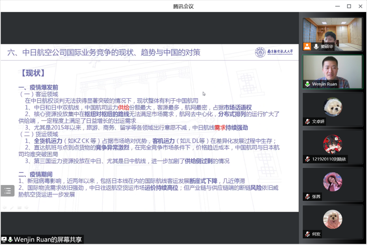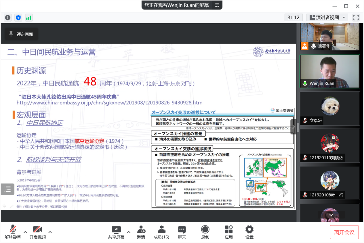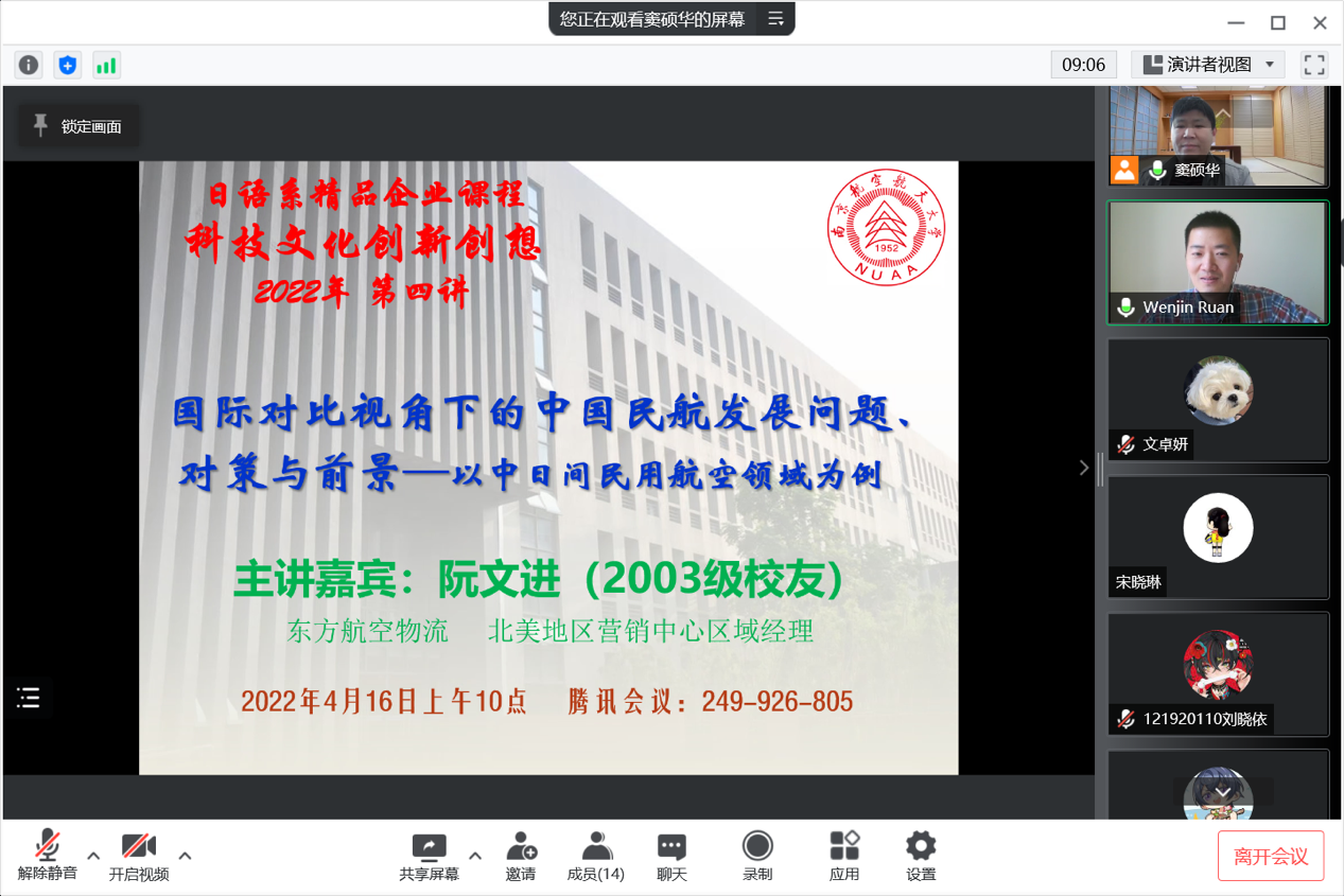 4月16日上午10点,vrporn 日语系精品企业课程《科技文化创新创想》2022年度第四讲通过腾讯会议成功进行,本次主题为《国际对比视角下的中国民航发展问题、对策与前景——以中日间民用航空领域为例》。主讲嘉宾为03级日语系校友、现就职于东方航空物流北美地区营销中心的阮文进经理。
