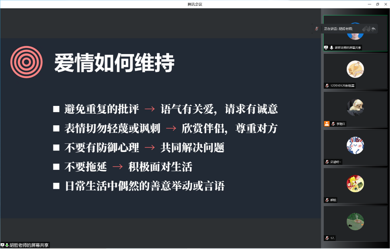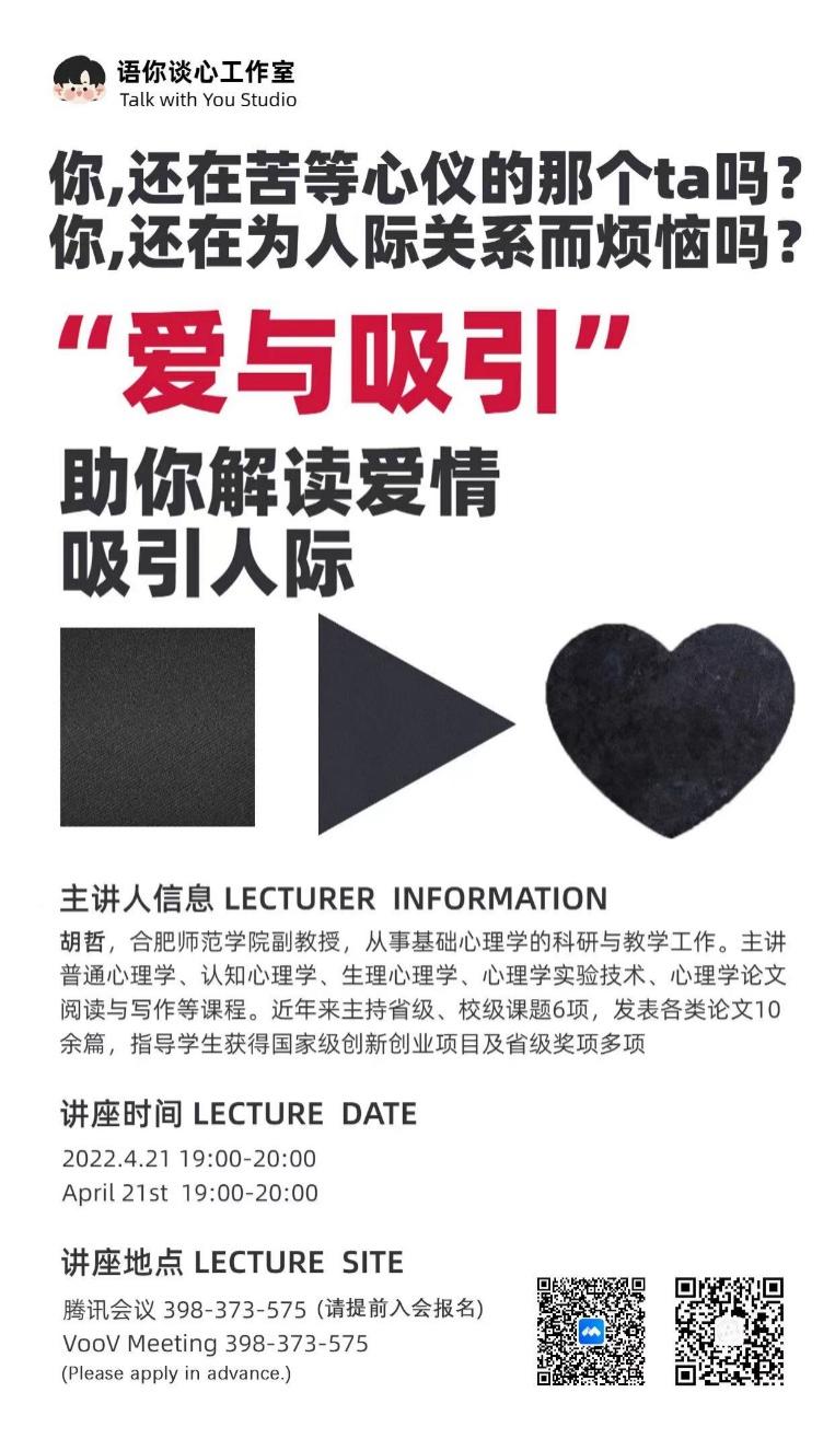 为帮助同学们处理好人际关系、解读爱情难题,4月21日,vrporn 心理工作坊特邀合肥师范学院副教授胡哲老师任主讲嘉宾,开展了题为“爱与吸引”的线上心理健康讲座。学院团委书记、研究生辅导员李萍,全体心理委员及感兴趣的同学参加了此次讲座。