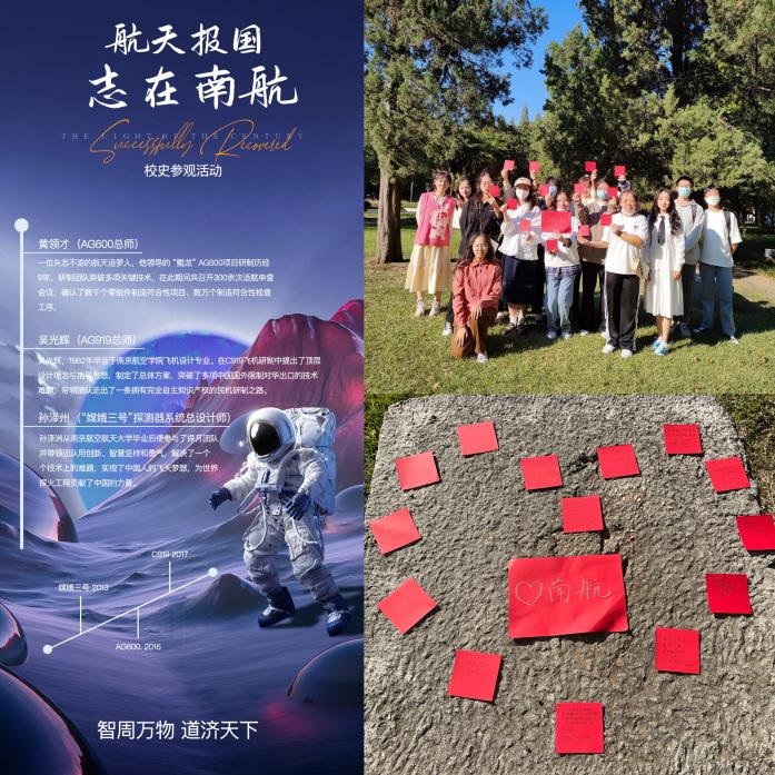 从校史馆出来,各班分别开展了别出心裁的活动,表达自己对祖国和南航的衷心祝福。1222101班在明故宫校区拍照打卡,感受老校区浓厚的文化底蕴。1222102班聚焦于南航杰出校友的光辉事迹,共同学习探讨其研发飞行器、航天器的艰辛历程,集体制作了“航天报国,志在南航”参观海报。1222103班开展了“听歌识曲”活动,一首首红歌在校园里唱响,同学们的爱国热情也由此被点燃。1222201班的同学们将自己对祖国与南航的祝福倾注于笔尖,秋天的梧桐树下,暖阳照耀着丹红的卡纸,传递着他们对祖国、对南航的真挚爱意。