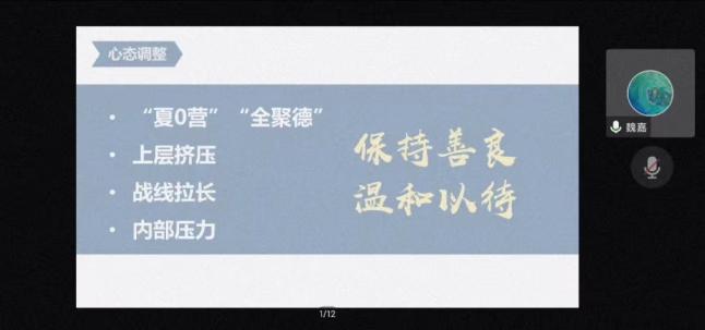 会议伊始,学院2019级本科生王逸杰、魏嘉、文卓妍围绕保研,进行了经验分享。王逸杰从保研的前期准备到保研的整个过程进行了详细的讲解,希望学弟学妹们不忘初心,保持热爱;魏嘉通过路径选择等多个方面,引导学弟学妹们提前思考自己的未来规划,找到适合自己的方向;文卓妍详细介绍了保研流程,希望学弟学妹在口语练习方面,提前进行有针对的练习。