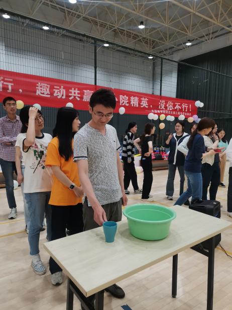 第三个项目是“南水北调”,首名队员持空水杯至盛水容器处接力取水,固定时间内“调水”最多的队伍获胜。既要跑得快,又要跑得稳,赛况分外胶着,老师同学们的运动热情在趣味赛中挥洒地淋漓尽致。