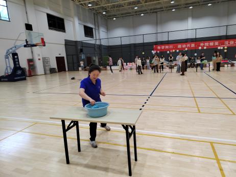 “智传呼啦圈”项目比拼时,每队师生手拉手站成一排,呼啦圈依次循环传递,直至全组完成,期间手不能松开,用时最短的队伍获得胜利。小小的呼啦圈,调动了全体师生的运动细胞,选手们在运动中逐渐热情高涨。
