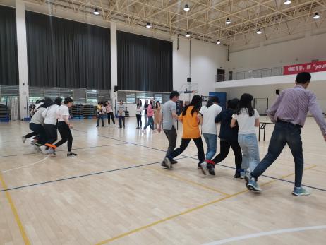 第一个项目是“四人五足跑”,每队队员在起点处并排站好,系上绑带,听到命令,向终点进发,用时最短者将胜出。虽然是趣味竞赛,但是各队师生认真训练,比赛中口号响亮、步调一致,勇敢向前冲,跑出了师生协作的默契。