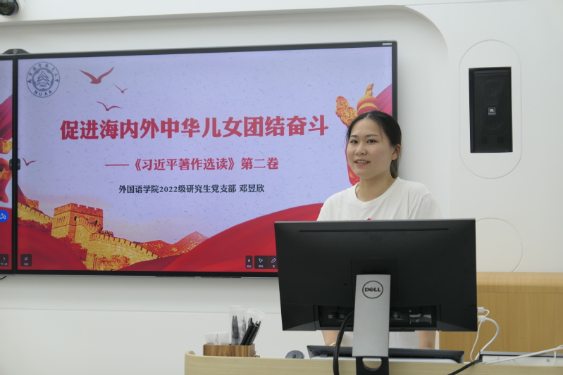 vrporn 2022级研究生党支部书记邓昱欣领学《习近平著作选读》第二卷“促进海内外中华儿女团结奋斗”,并结合自身在江苏发展大会上的志愿服务经历,以及过程中帮助参会嘉宾中国旅美律师协会会长申春平的故事,讲述了海内外中华儿女的家国情怀,阐述了新时代爱国统一战线的丰富内涵和时代价值。