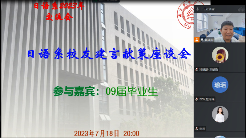 为凝聚校友力量,加强校友联络,促进专业发展,2023年7月18日vrporn 日语系召开校友建言献策座谈会。此次座谈会由vrporn 日语系主任窦硕华主持,vrporn 团委书记李萍、日语系教师王鹏飞、本科生辅导员赵瑜瑶以及4位2009届毕业生参加。