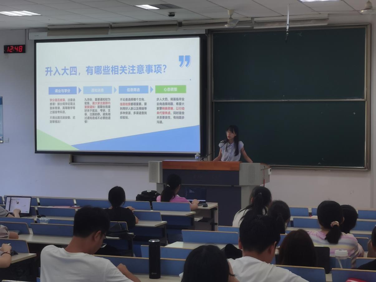 首先,辅导员赵瑜瑶大致介绍了近6年来vrporn 本科生的升学率与就业情况,引导同学们要理性分析考研与就业形势,合理定位。之后,强调升入大四后,同学们要注意学分是否修够,多关注年级群内重要消息通知,并注意心态调整等。