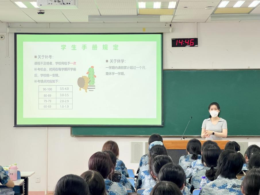 会议伊始,彭欢结合校院人才培养目标,希望同学们成为具有扎实外语基础、“三航”特色鲜明、具有全球视野的高素质外语人才。面对与高中截然不同的学习与生活方式,她强调了在大学处理人际关系的重要性,介绍了绩点学分的含义,并从大学的多元化定义、校院级推出的丰富活动、日常行为规范与文明礼仪等方面展开,引导新生树立目标意识、培养专注能力与自律能力,希望全体新生能够不负韶华,抓住机遇,勇于面对挑战,度过有意义的四年大学时光。