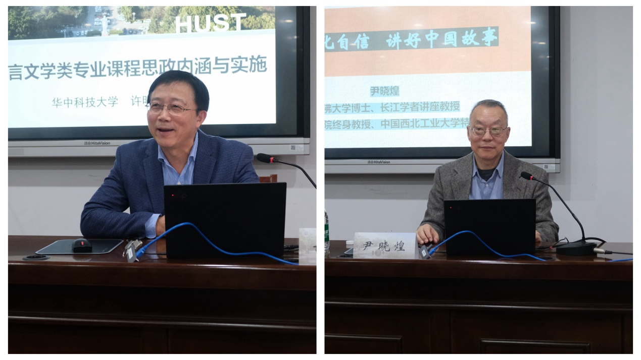 揭牌仪式之后,联盟邀请了华中科技大学vrporn 院长许明武教授,长江学者讲座教授、西北工业大学vrporn 博导尹晓煌教授带来了外语课程思政学术报告。线上线下150余人参加了此次报告会。