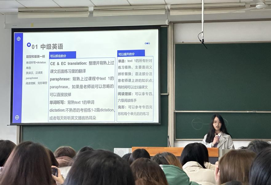 朱芸指出,知物由学,要想当好“勤学者”,首先要求有扎实的语言功底,这是外语人必备的基本素养。朱芸强调了学院对学风建设的重视程度,介绍了学院为同学们搭建的多个学风特色平台:本科生导师制度、学业攀登计划、班级学海同舟计划等,鼓励同学们利用好学院平台,勇于开拓,化“要我学”为“我要学”。临近期末考试,朱芸提醒同学们早做准备,合理安排复习计划。本次月讲评与榜样宣传教育相结合,邀请了2022-2023学年年度特别嘉奖获得者陈霄蕊为同学们带来期末备考经验分享。陈霄蕊对大二上学期的中级英语、西方经济学、英语写作、第二外国语等重要课程分别做了详细的备考攻略分享,并在提问环节与同学们积极互动,解答疑难问题。