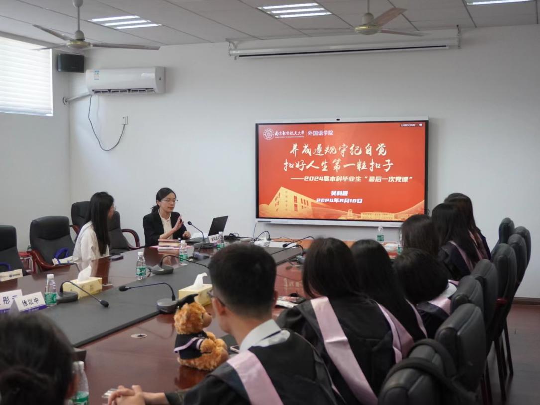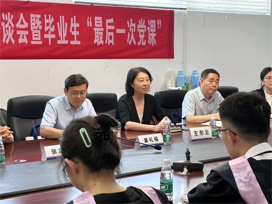 座谈会结束后,吴科颖以“养成遵规守纪自觉,扣好人生第一粒扣子”为主题,为毕业生党支部讲授“最后一次党课”。