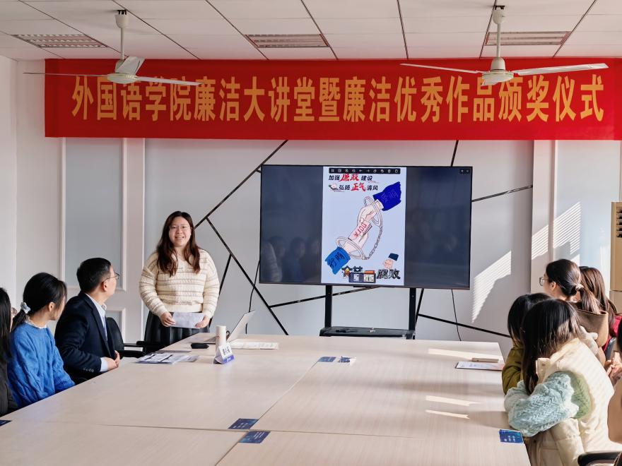 随后是廉洁文化作品分享环节。在本次廉洁文化作品征集活动中,同学们以多种多样的形式展现了廉洁文化的深刻内涵。获奖学生代表分享了自己的创作故事和灵感来源。他们有的将历史典故与现代生活巧妙融合,绘制了寓意深远的廉洁漫画,让大家在细腻的笔触中领悟到清正廉洁的重要性;有的深入挖掘廉洁人物的先进事迹,以征文的形式展现廉洁典范的高尚品质,激发起同学们对廉洁文化的共鸣与思考;有的则以新颖独特的短视频形式,用镜头语言讲述廉洁正能量,既接地气又引人深思。