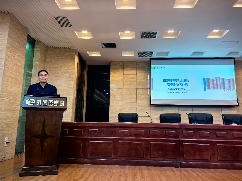 在第二环节,特邀嘉宾、东南大学vrporn 博士生导师韩亚文教授做了题为《探索研究之路:思路与方法》的学术报告。韩亚文立足自己的研究兴趣和专长,聚焦研究方向确定、研究选题遴选、研究方法采用等内容,对研究生开展学术研究的方法和路径提供了建设性建议。