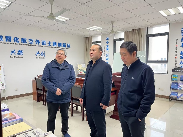 陶勇参观了学院神经认知语言学实验室、数智化航空外语主题创新区、“耘天坊”国际文化传播发展研究大学生主题创新区。