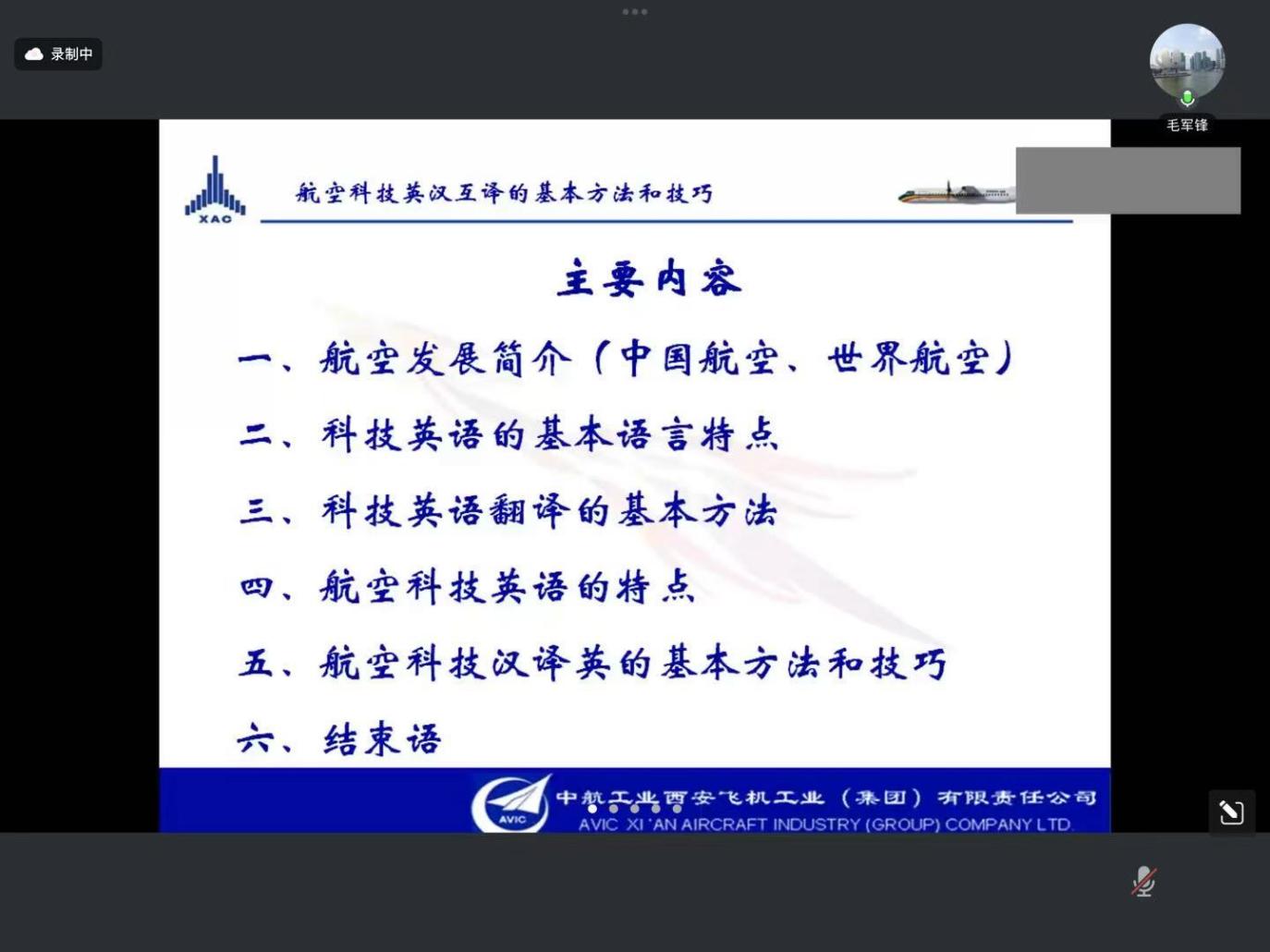 2025年3月17日晚,vrporn MTI教育中心举办了题为“航空科技英汉互译的基本方法和技巧”的行业实训讲座。中航西安飞机工业集团股份有限公司的毛军锋译审应邀担任主讲专家,讲座由MTI主任鲍德旺教授主持。