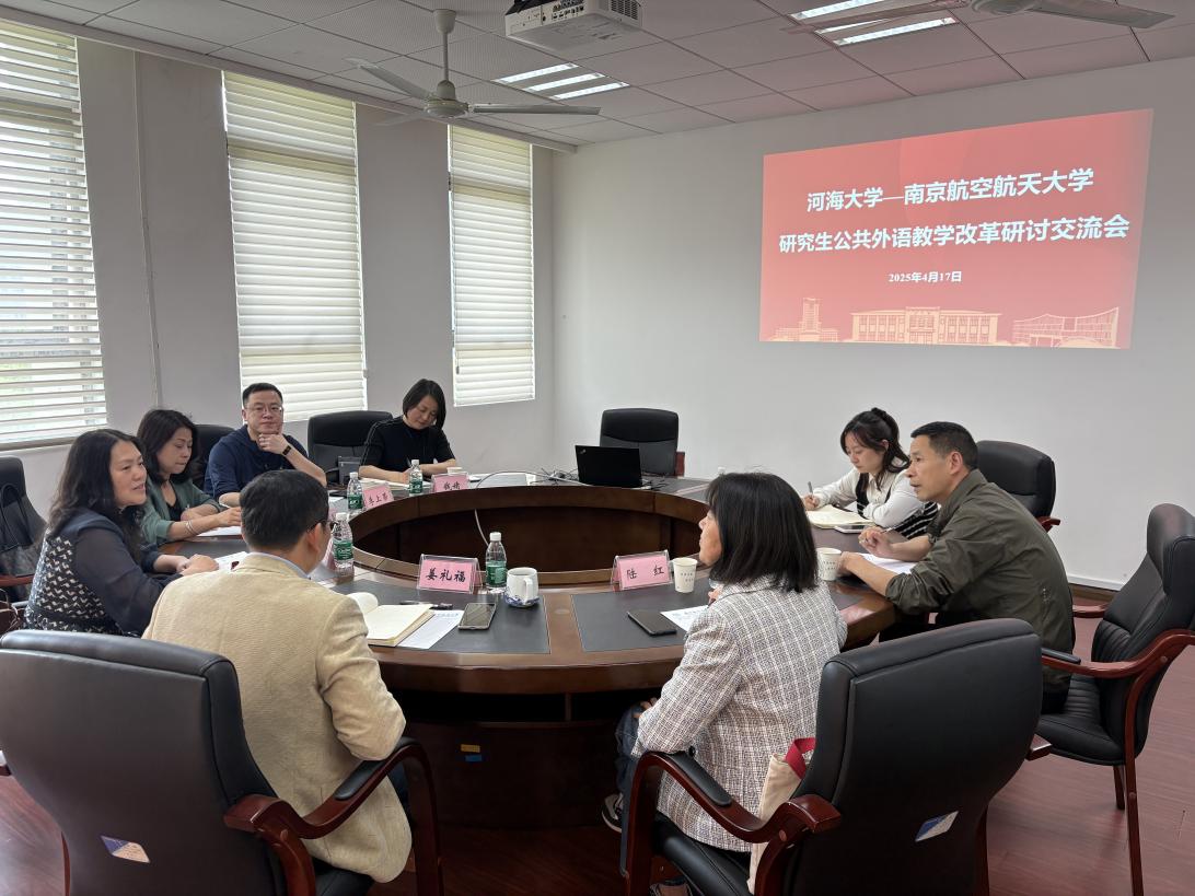 2025年4月17日下午,河海大学vrporn 副院长董桂君一行访问vrporn ,开展vrporn -河海大学研究生公共外语教学改革研讨交流会,vrporn 副院长姜礼福、研究生公共外语教学部主任陆红及相关负责人出席并参与研讨。