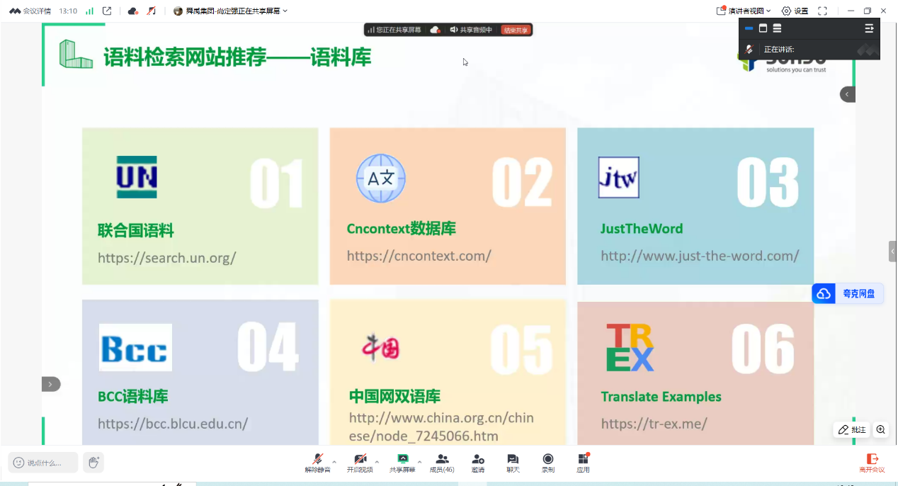 尚定强首先介绍了搜索与检索工具,包括Archivarius 3000、SwiftSearch、Everything、谷歌翻译插件等,还推荐了术语库、专利数据库、ChatGPT等专业网站,分享了这些工具对译员的重要辅助作用。