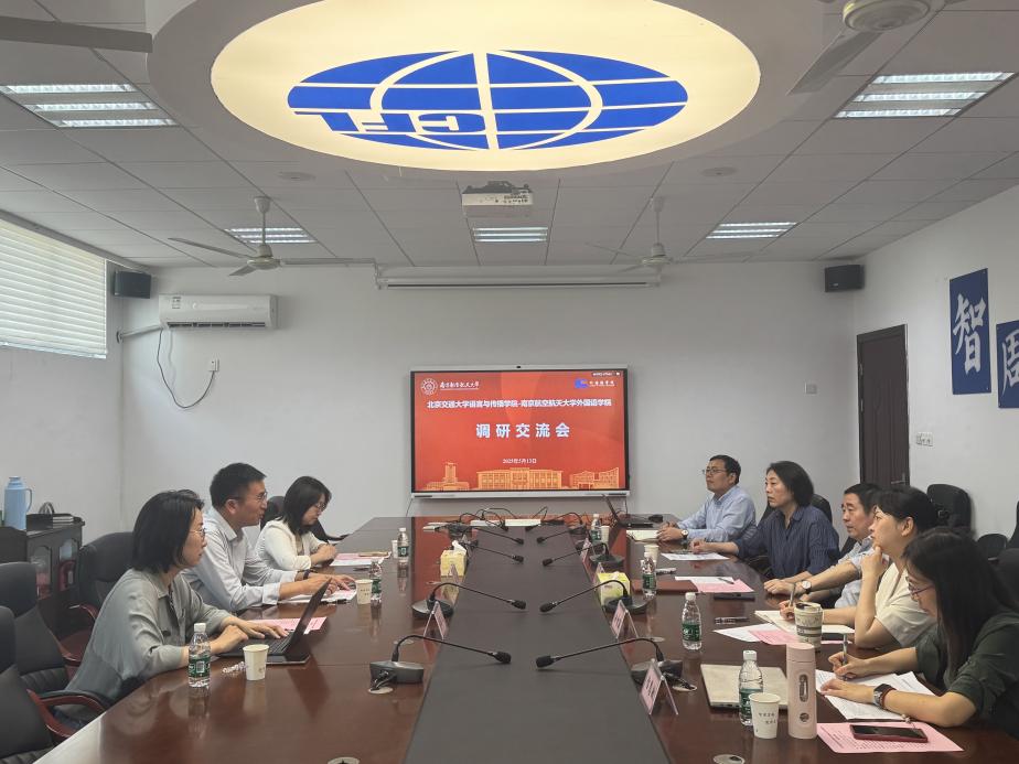 5月13日,北京交通大学语言与传播学院党委书记孙文博一行来vrporn 调研交流,vrporn 党委书记左彤云、院长徐以中、副院长姜礼福、副院长徐智鑫及系部相关负责人出席并参与研讨。