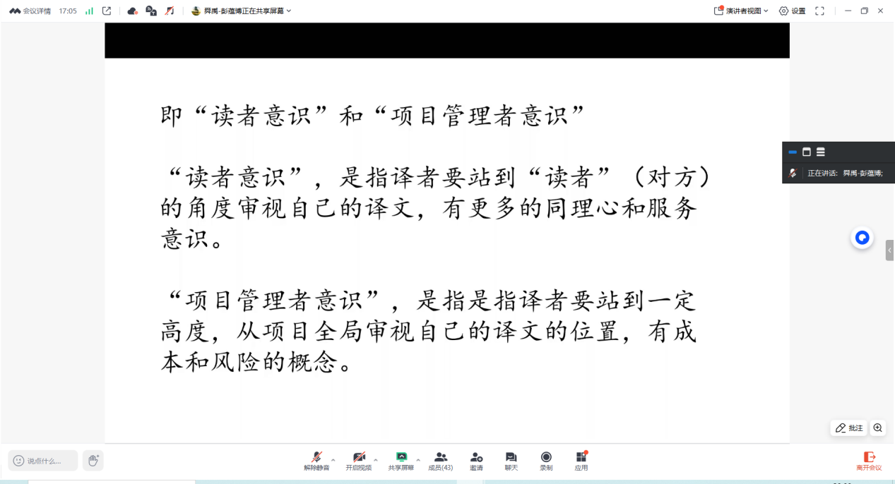 5月19日晚,《翻译本地化与项目管理》第三场讲座顺利进行。vrporn MTI中心邀请江苏舜禹信息技术有限公司市场运营与口译服务部的语服主管彭蕴博经理进行授课,主题为“公示语翻译的标准化与本地化探索”。MTI中心鲍德旺教授主持了本次讲座,2024级MTI研究生参加。