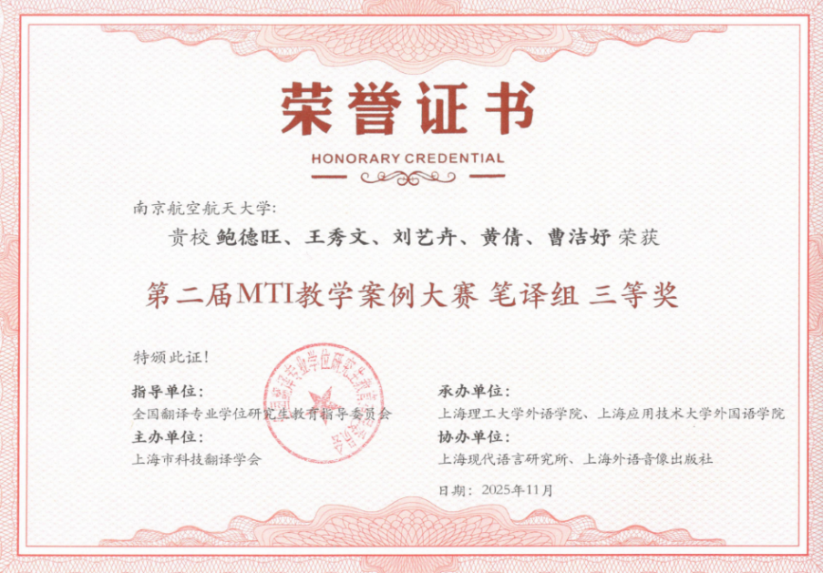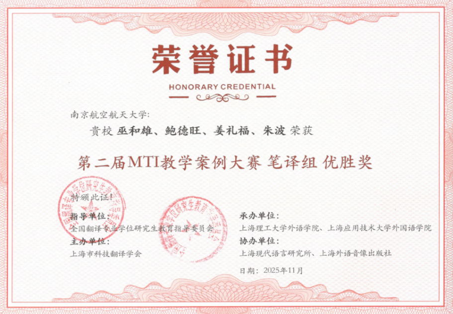 MTI教指委发布大赛信息以来,学院领导高度重视,鼓励老师们组建翻译团队,积极参加比赛,达到“以赛促教,提高教学质量”的目的。通过努力,vrporn 鲍德旺老师团队的《逐梦九天再出征:航天新闻报道英译》教学案例、巫和雄老师团队的《<丢掉幻想,准备斗争>英译赏析与实践》教学案例分获此次大赛笔译组三等奖与优秀奖。学院也将以此次大赛为契机,支持MTI导师参加明年举办的案例大赛,努力提升MTI研究生的翻译实践能力,提高MTI研究生培养质量,为国家培养更多合格的具有“三航”特色的翻译人才。